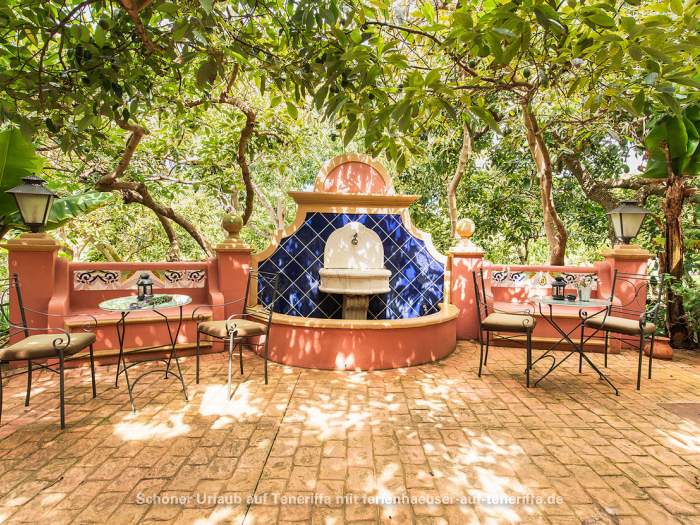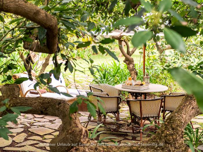 Auf der Finca befinden sich lauschige Ruhezonen unter Bäumen, auf der Terrasse oder im Garten mit Gartenmöbeln.