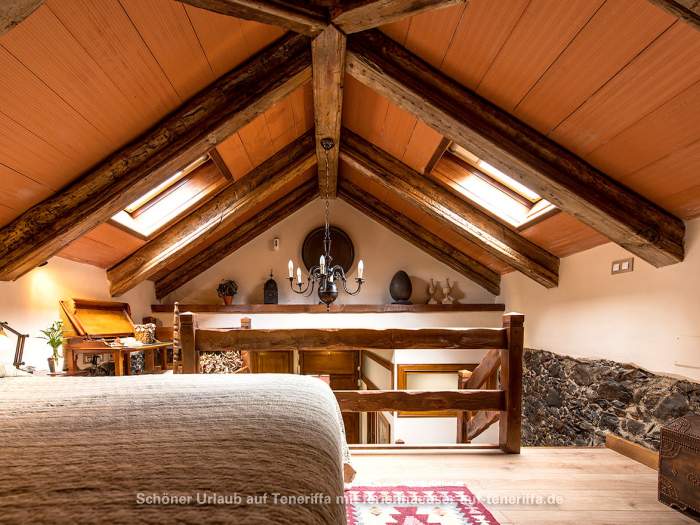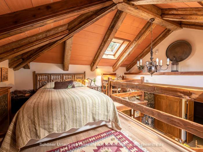 Das Schlafzimmer in der Galerie ist mit einem Doppelbett (140x200m) ausgestattet. Die Schlafcouch (130x190m) im Wohnraum bietet Platz für eine 3. Person. Es gibt ein Badezimmer in der Ferienwohnung.