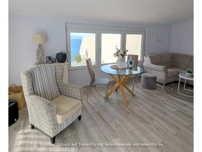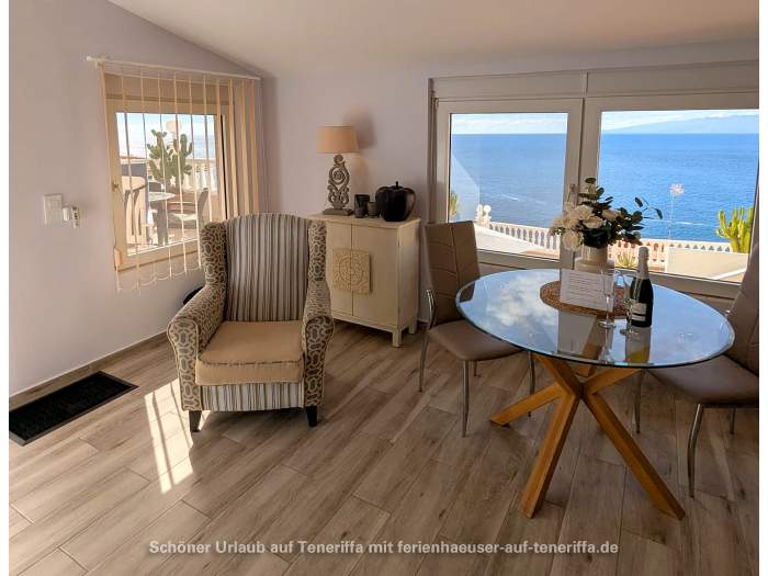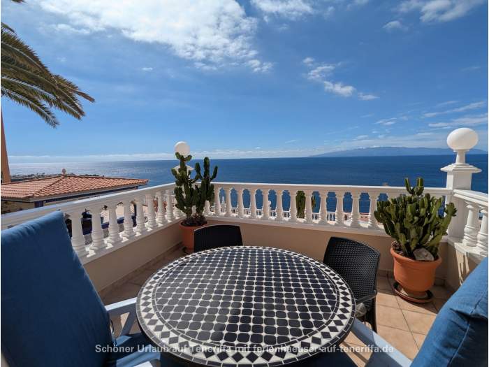 Nach skeptischer Anfahrt durch eine Häuserschlucht von Puerto de Santiago öffnet sich die Tür zu einem kleinen Paradies. Nach herzlichem Empfang durch die gute Seele des Hauses Alena haben wir erst mal den herrlichen Blick übers Meer nach La Gomera genossen, der sich uns sowohl von der eigenen Terrasse, als auch vom Wohnzimmer bot.