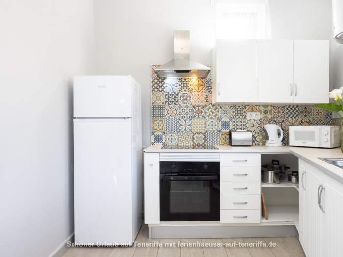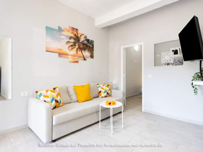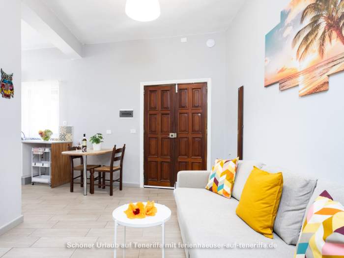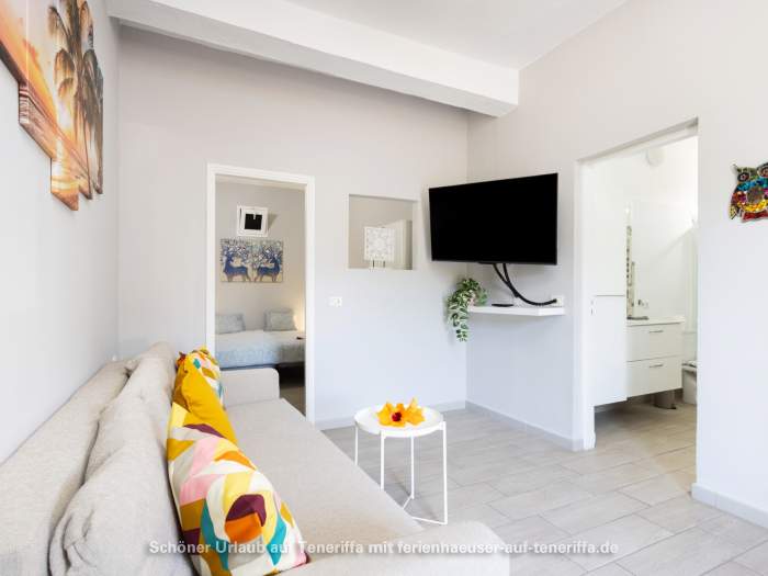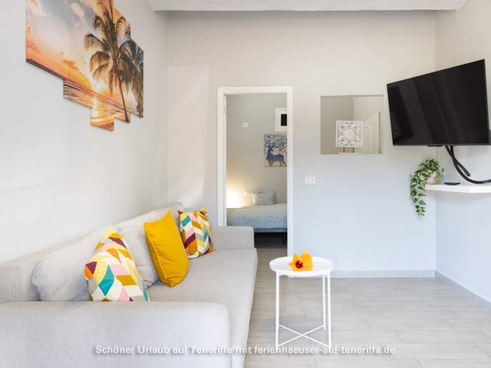 Die 61m² große Ferienwohnung verfügt über ein Wohnzimmer mit Sofa, Fernseher (deutsche Programme), Küchenzeile und Esstisch für drei Personen. Die Küche ist mit Herd, Mikrowelle, Kaffeemaschine, Toaster, Mixer (Batidora), Wasserkocher und mehr ausgestattet. Das Schlafzimmer ist mit einem Doppelbett eingerichtet.