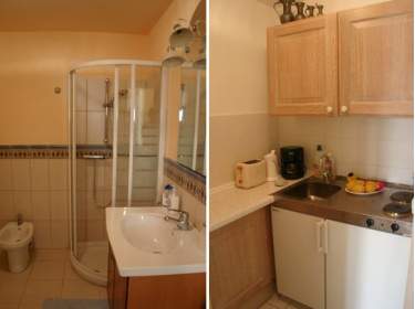 Auf 40 m² Wohnfläche, die sehr komfortabel ausgestattet sind, sind ein Schlafzimmer mit großem Doppelbett (200x200), eine sehr gut ausgestattete Küche, ein Wohnzimmer mit SAT-TV und ein Duschbad mit Bidet, Kosmetikspiegel Fön und zwei Bademänteln untergebracht. Die herrlich große Terrasse kann mit einem Tisch, vier Stühlen, zwei Sonnenliegen und einem grandiosen Meerblick aufwarten.