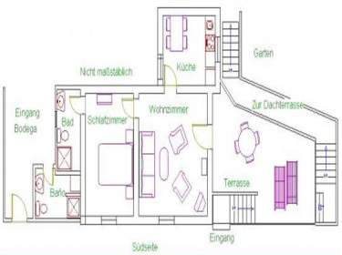 Hier präsentieren sich schöne 40 qm Wohnfläche zuzüglich 20 qm möblierte Terrasse in einem freistehenden Haus. Neben einem schönen Duschbad, einem Schlafzimmer mit Doppelbett und einem Wohnzimmer mit SAT-TV und einem Essplatz für 4 Personen gibt es eine integrierte Küche mit Backofen, Ceranfeld, Dunstabzug, Kühlschrank, Kaffeemaschine, Toaster, Saftpresse, Wasserkocher und vielem mehr.