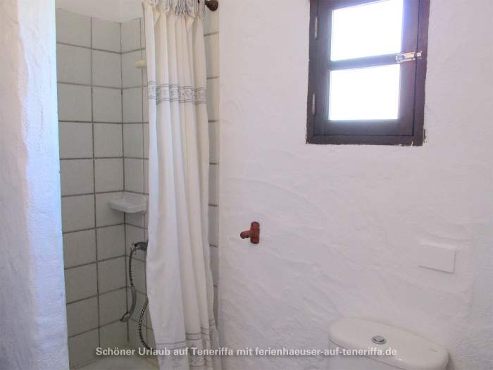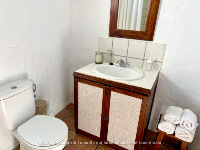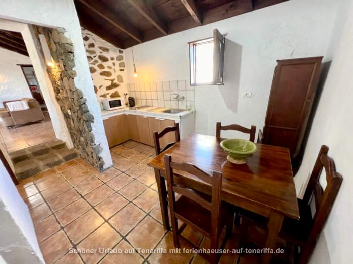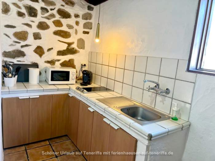 Rechts vom Wohnzimmer gelangen Sie über einen kleinen Flur zur Küche und zum Bad. Das Badezimmer bietet Dusche, WC und Waschtisch. Die traditionelle kanarische Küche verfügt über einen Esstisch für vier Personen, einen 2-Platten-Herd, Kühlschrank mit Gefrierfach, Kaffeemaschine, Mikrowelle, Toaster, Wasserkocher sowie ausreichend Geschirr, Besteck und Kochutensilien.