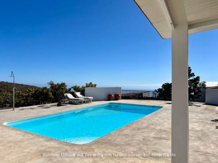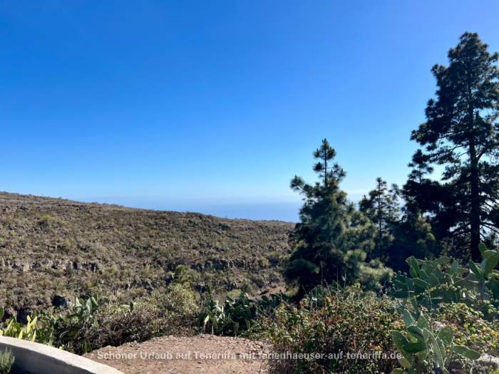 Vom Pool aus schweift der Blick über vereinzelte höher gelegene Häuser, die umliegenden Berge und den entlang der Grundstücksgrenze verlaufenden Barranco hinunter zur Westküste bis zum Atlantik. Bei klarer Sicht erscheinen sogar die Nachbarinseln La Gomera, La Palma und El Hierro.