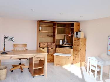 Arbeitsbereich: Ein separater, lichtdurchfluteter Raum mit großen Fenstern und Glasfaser-Internet. Ideal für digitale Nomaden, die Arbeit und Freizeit verbinden möchten, während sie ihre Kinder im Pool im Blick behalten.