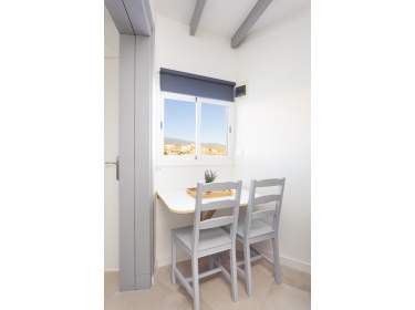 Das Studio bietet direkten Zugang zum Pool und verfügt über eine kleine private Sitzecke vor dem Eingang. Im Inneren erwartet die Gäste ein kombinierter Wohn- und Schlafbereich mit einer integrierten Kitchenette. Der Raum ist ausgestattet mit einem Doppelbett (150 x 200 cm), einem Sofa, einer gemütlichen Sitzecke, einem offenen Schrank sowie einem Smart-TV. Nachttische mit Lampen, ein Safe, ein Feuerlöscher und ein Wäschekorb gehören ebenfalls zur Ausstattung.